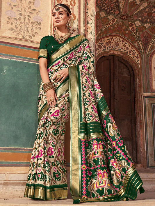 Professionally crafted with expert precision, the Green Soft Dola Silk Paithani Patola Saree boasts intricate...