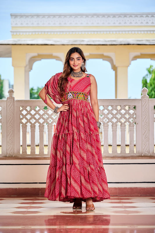 Step into ethnic elegance with this stunning Maroon Bandhani Print Gown crafted in premium Faux...
