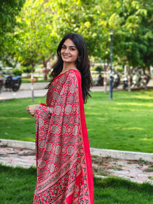 Red Ajrakh Gajji Silk Ajrakh Fancy Pallu saree Available in Gaji silk Ajrakh natural mill...