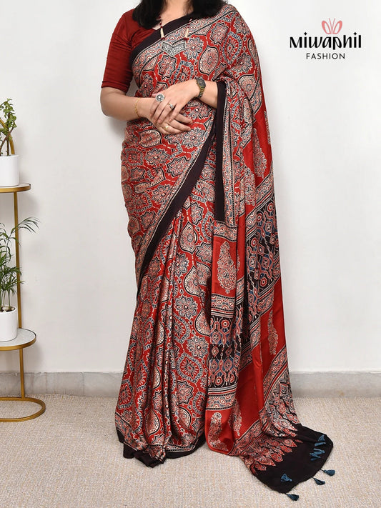 New Ajrakh Modal Silk Ajrakh Fancy Pallu Saree Available in modal silk ajrakh natural mill...