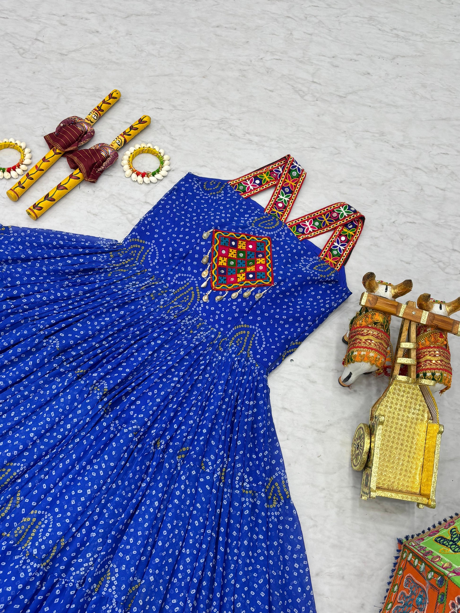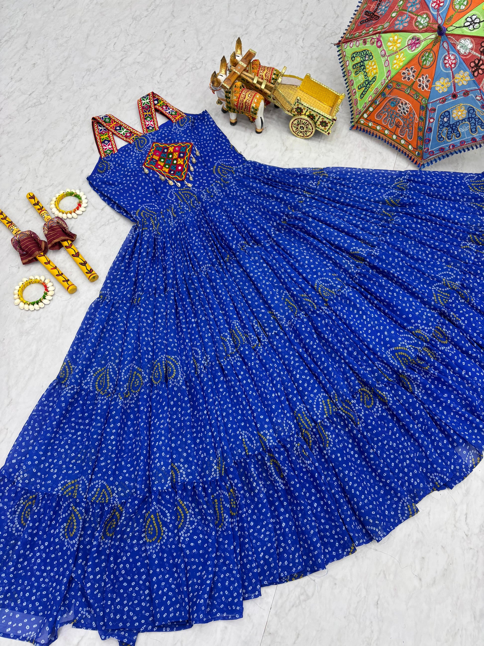 Experience the elegance of traditional craftsmanship with this Bandhani Print Georgette Gown, adorned with Gamathi work, real mirror accents, and original codi lace. This fully stitched gown features a rich 12-meter flair and soft micro cotton lining for comfort. Available in multiple sizes with margin up to 2XL – perfect for festive and party wear collections.