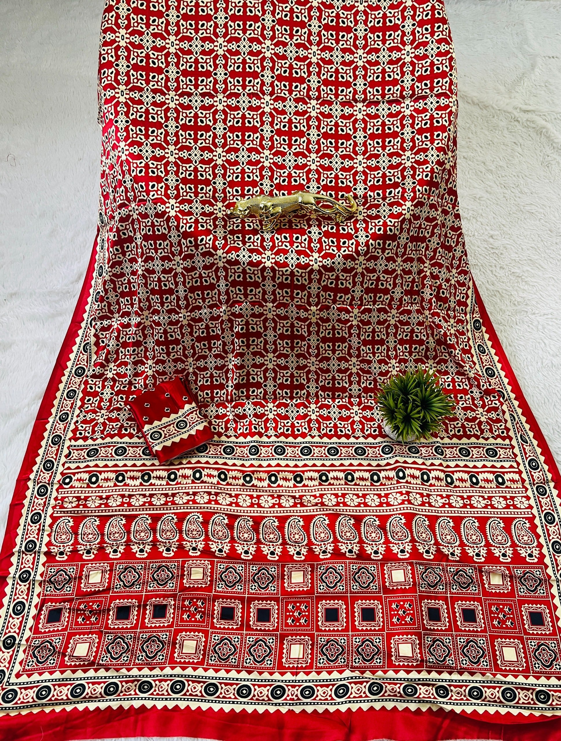 Available in semi gaji silk ajrakh natural digital print saree with ajrakh and fancy ajrakh pallu saree Same fabric Ajrakh blouse.
