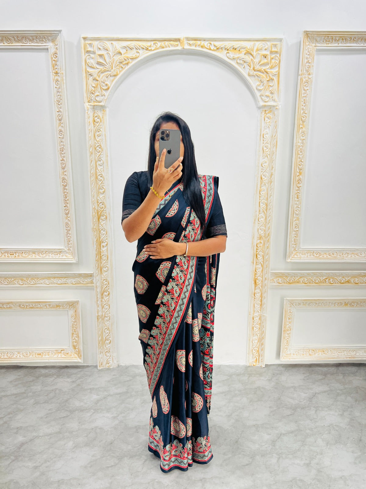 Saree work : Digital Print Border with Ajrakh Rich Pallu With Contrast Blouse