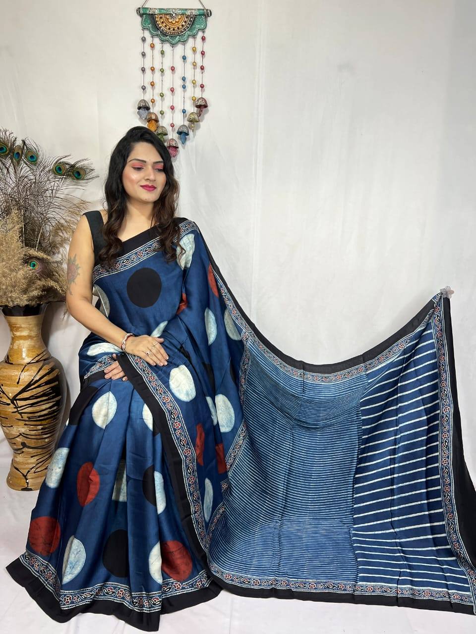 Blue Ajrakh Primum Modal Silk Saree With Blouse