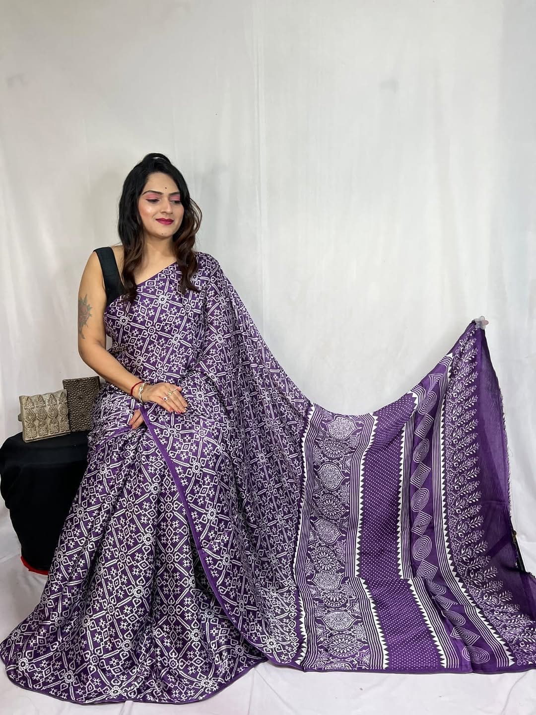 Violet Blue Ajrakh Primum Modal Silk Saree With Blouse
