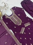 Wine Pure Chinon Silk Fabric With Beautiful Embroidery Sequence And Jari Work Plazzo Set