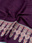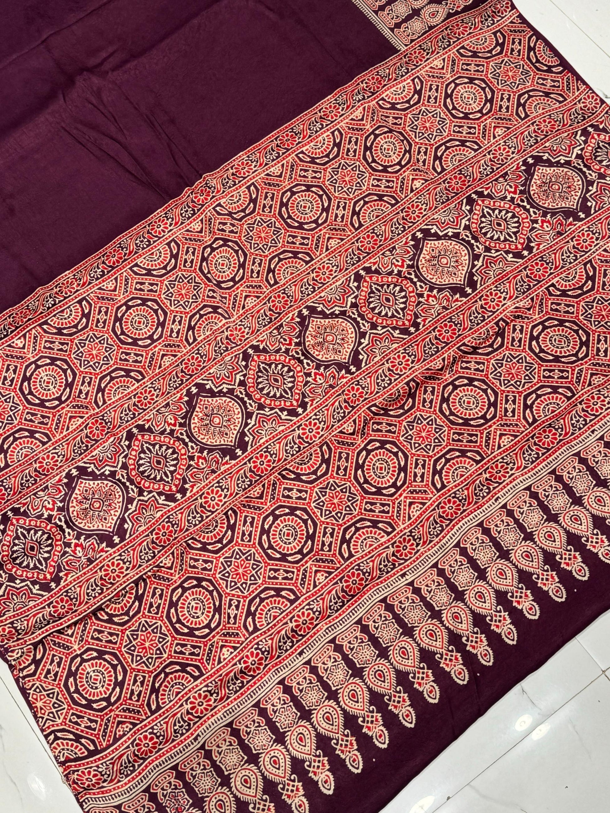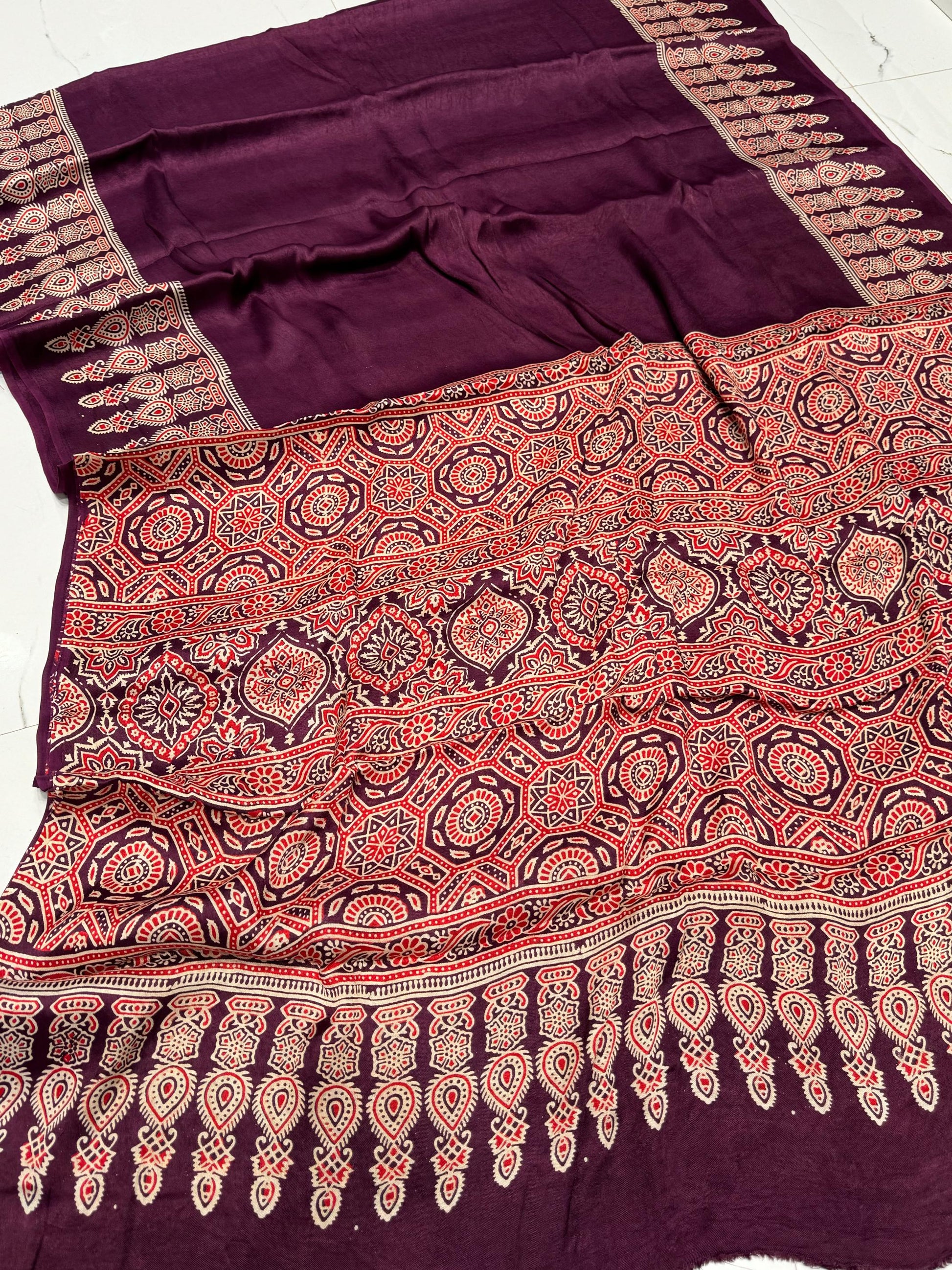 Wine Ajrakh Hand Block Modal Silk Saree With Fancy Ajrakh Pallu and Border