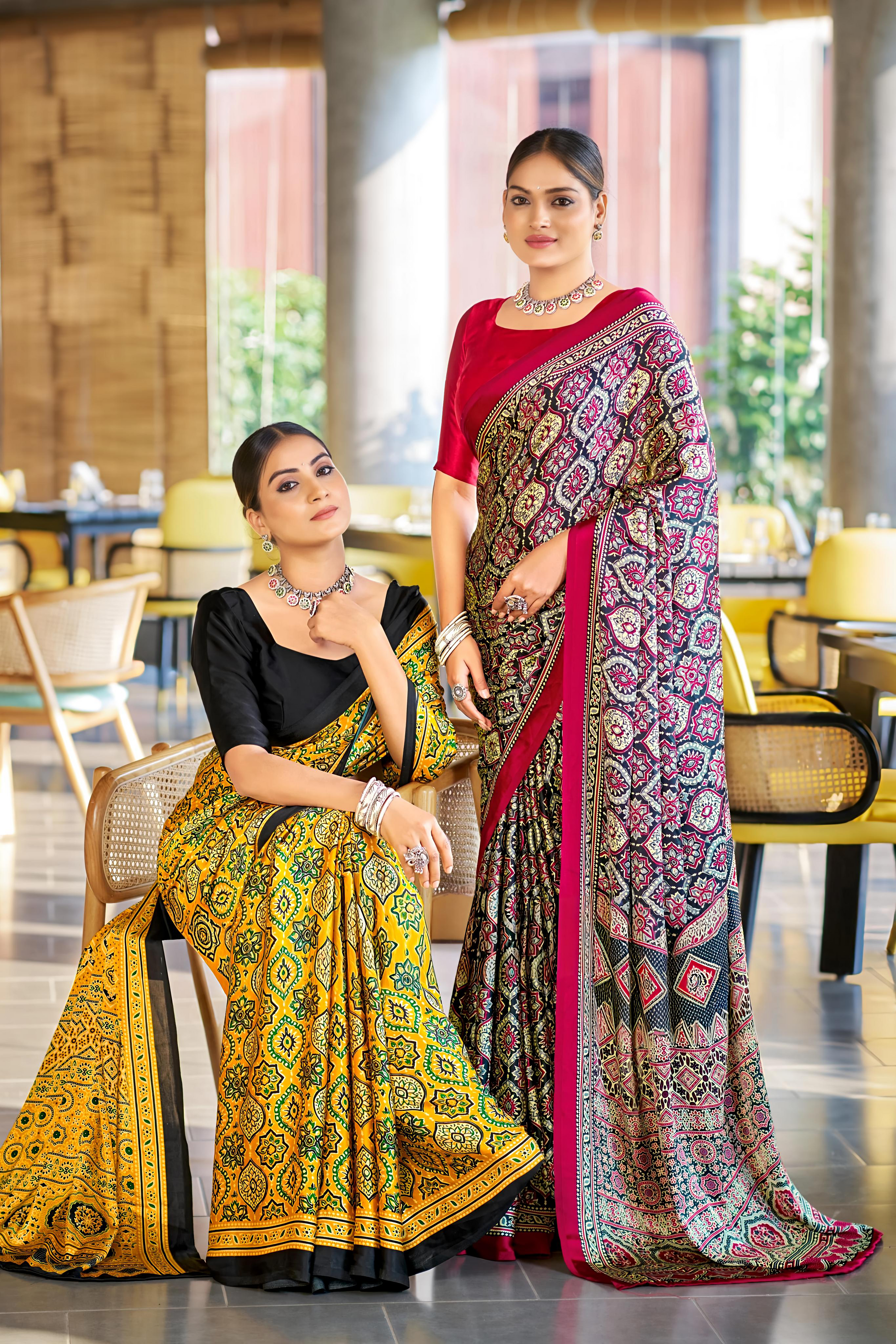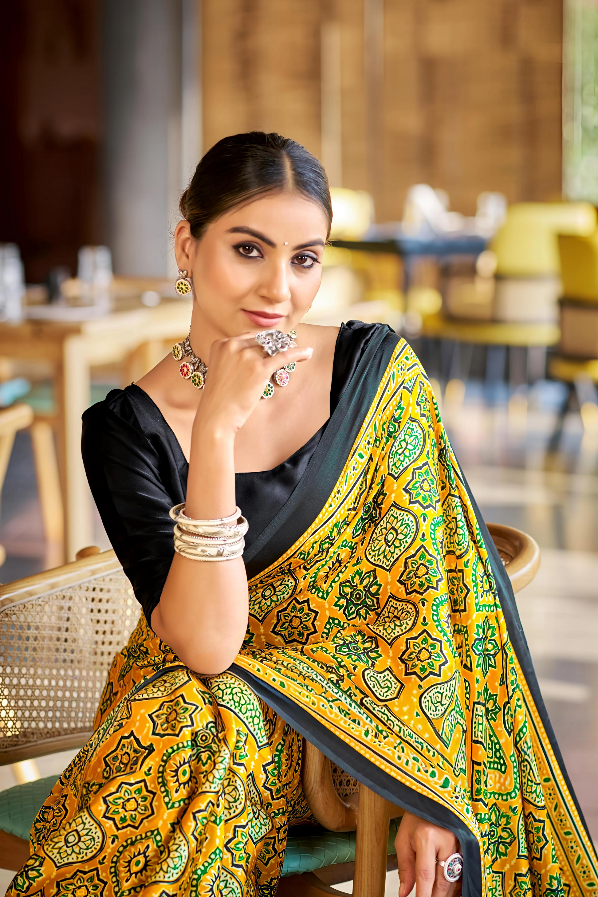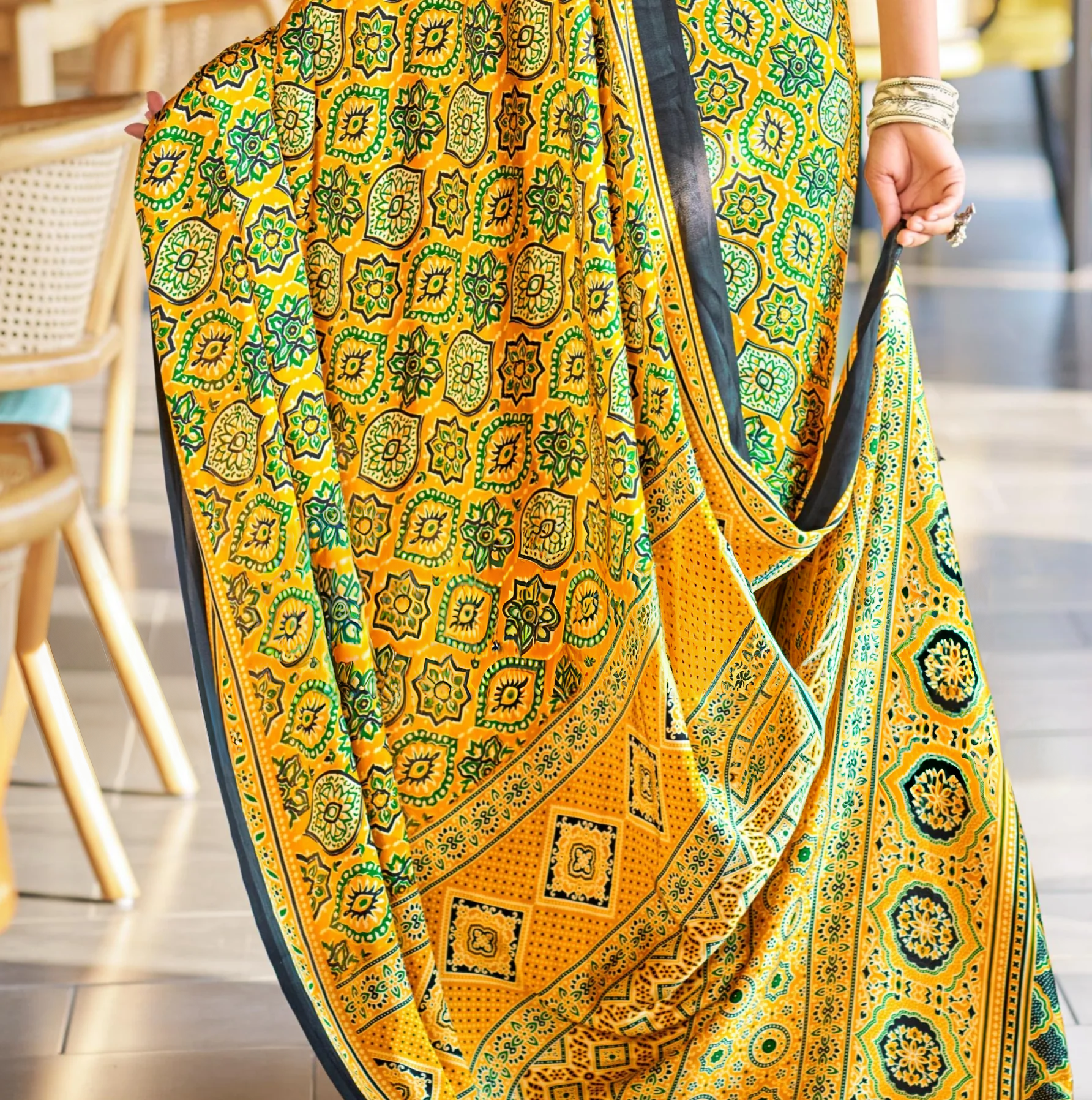 Brilliant Yellow Ajrakh Printed Soft Modal Silk Natural Print Saree P2