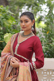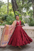 Appealing Maroon Lace Work Rayon Traditional Gown With Dupatta