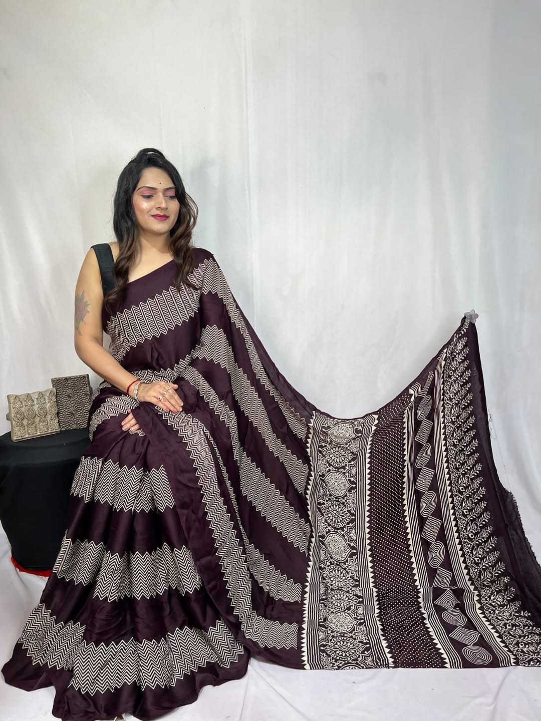 Wine Ajrakh Primum Modal Silk Saree With Blouse