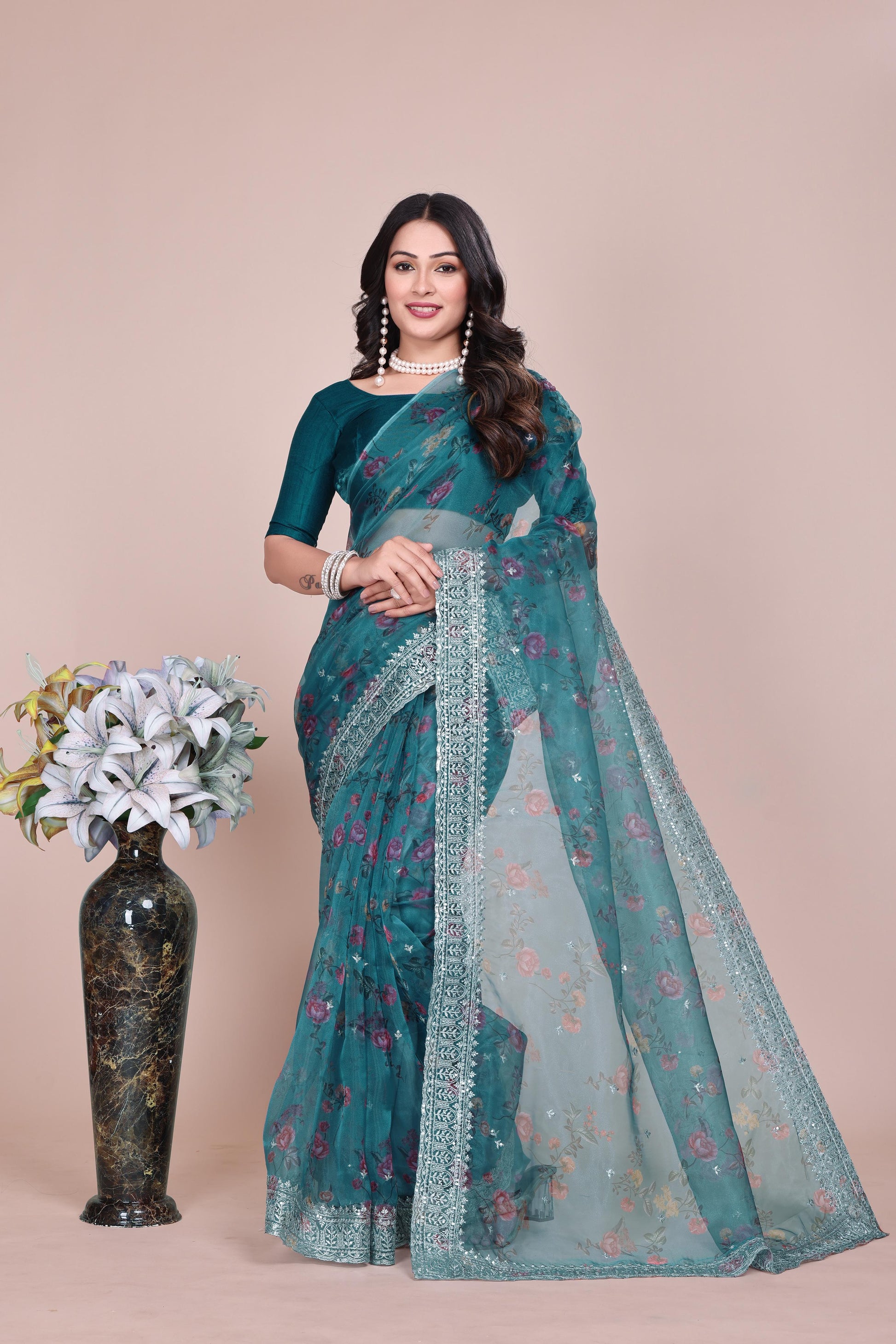 🏷️ Saree :- Tissue Organza With Beautiful Flowers Digital Print And Embroidery Zari + 3 MM Sequence C-Pallu Work