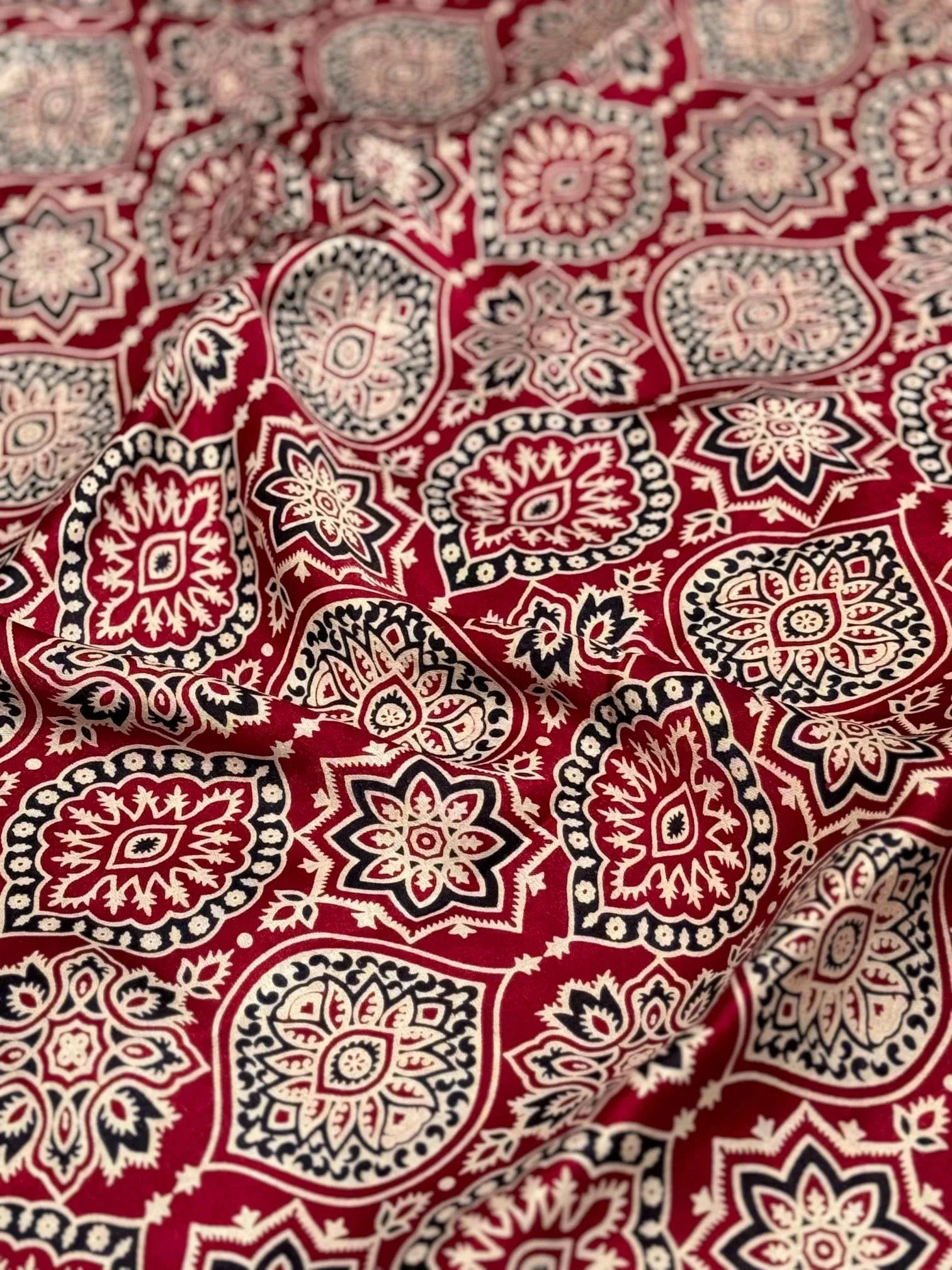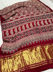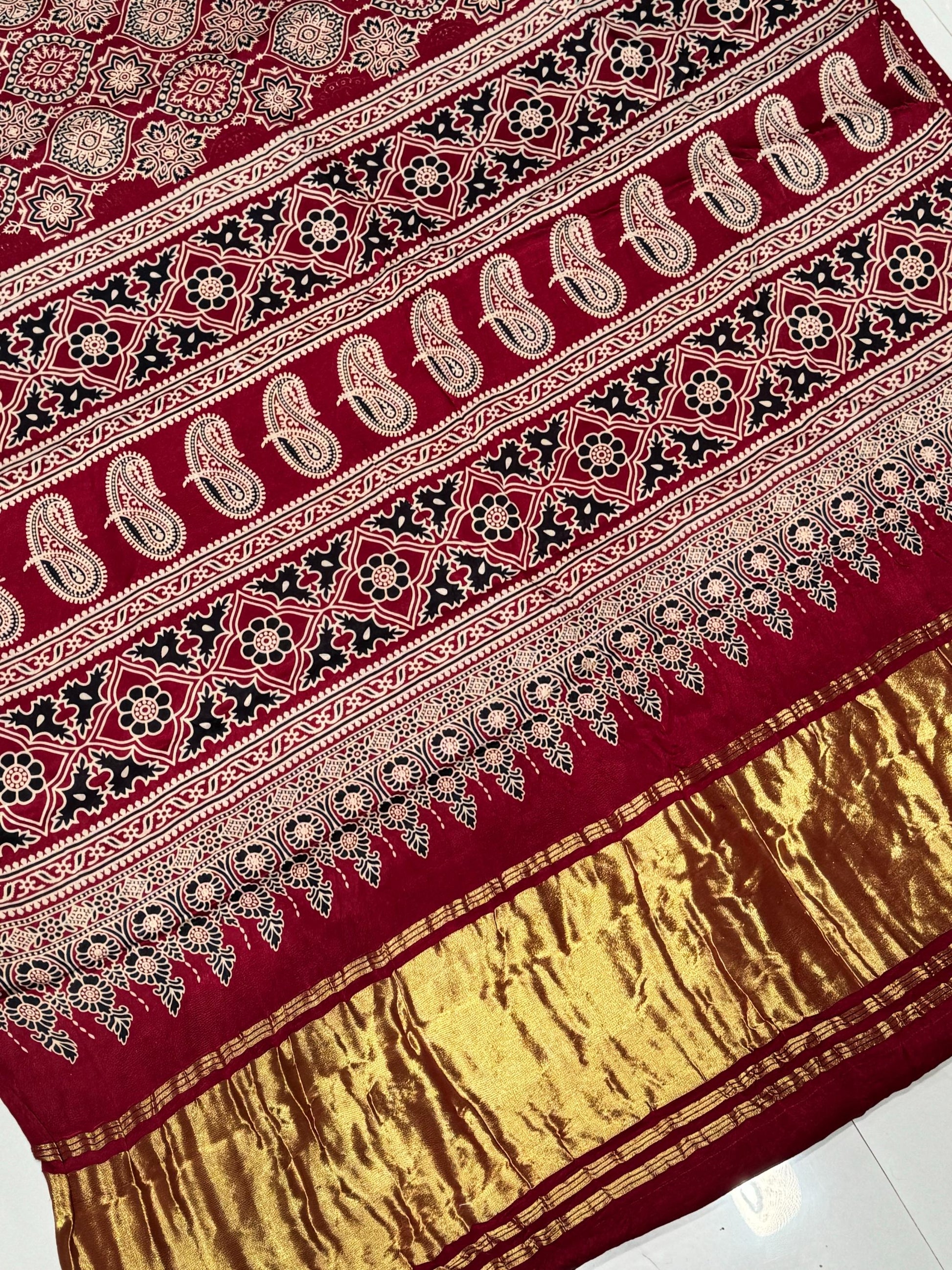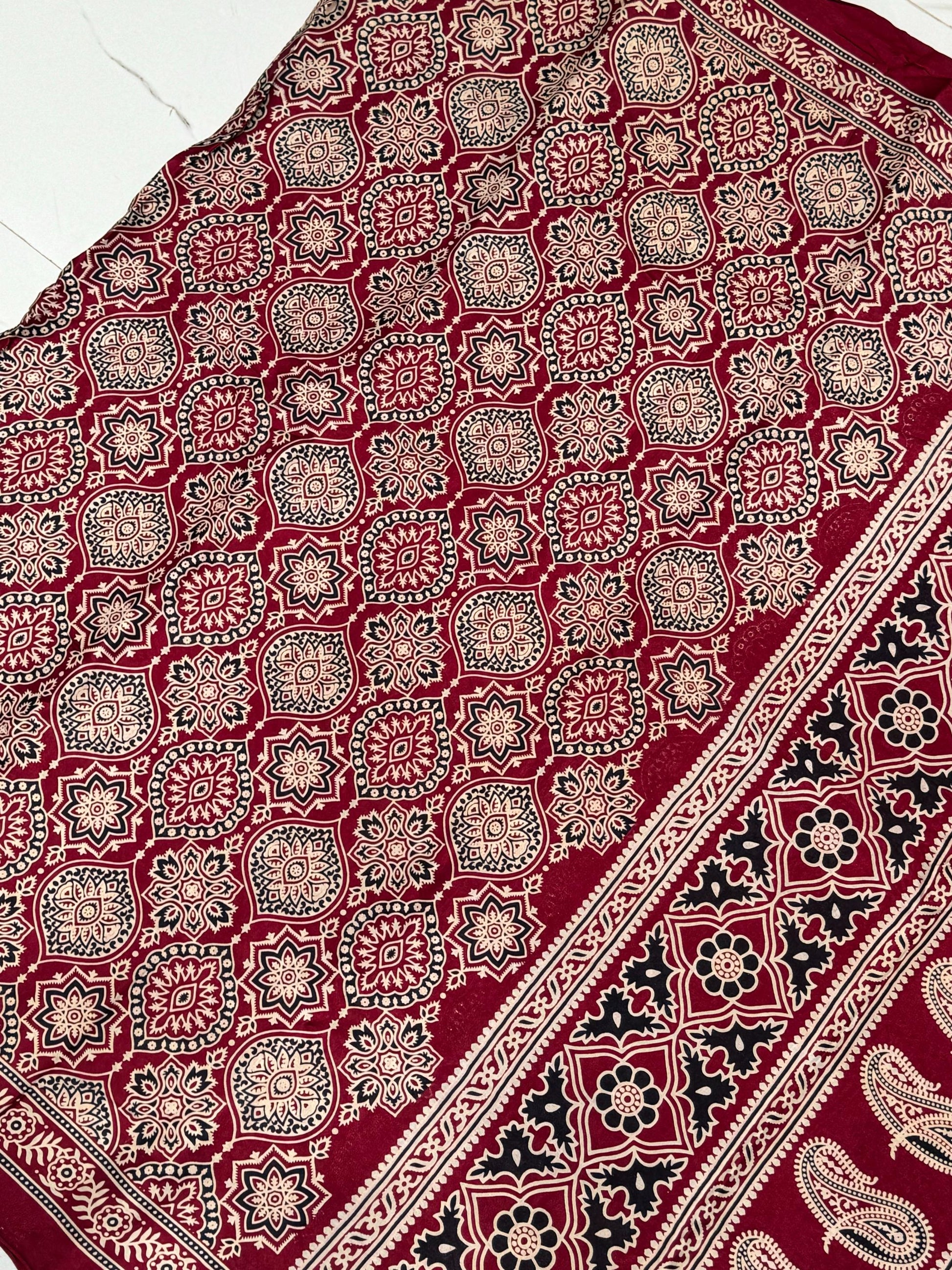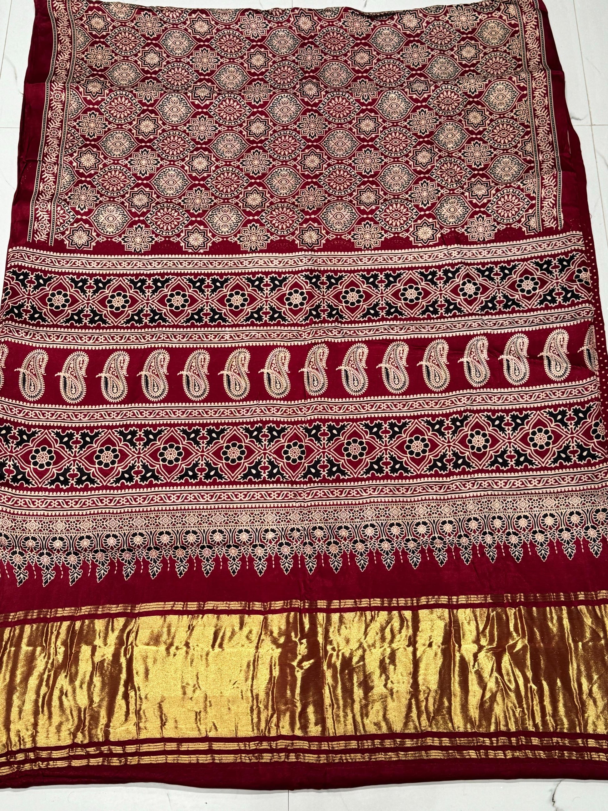 Maroon Ajrakh Hand Block Modal Silk Saree With Zari Pallu A2