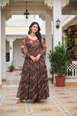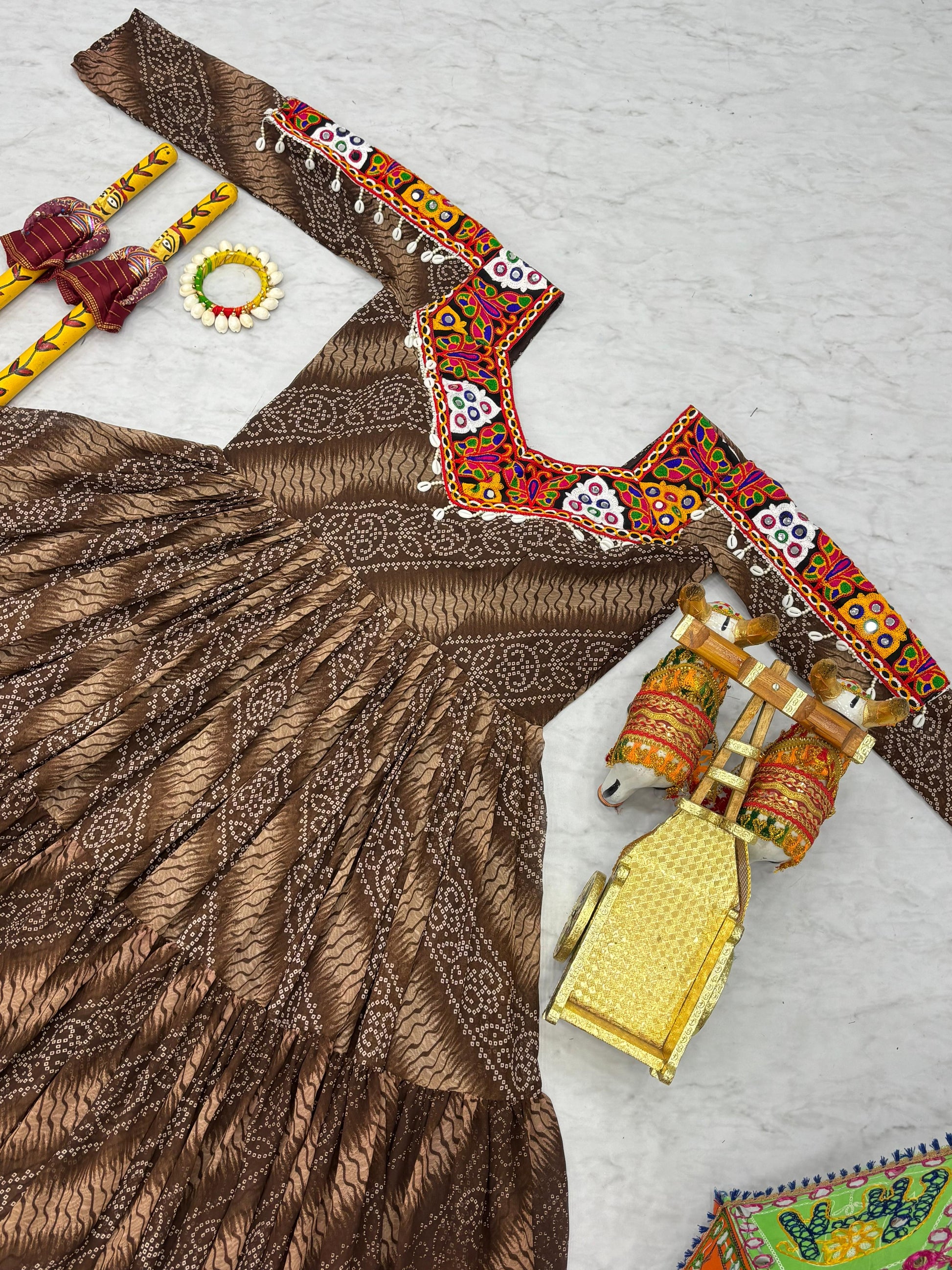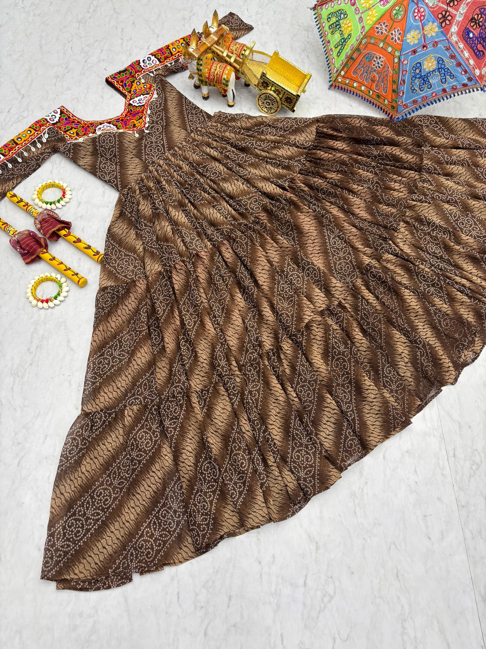 Step into ethnic elegance with this stunning Brown Bandhani Print Gown crafted in premium Faux Georgette. Adorned with original mirror Gamthi work and enhanced with delicate Cowrie (Kodi) lace, this gown brings together traditional charm and contemporary silhouette.