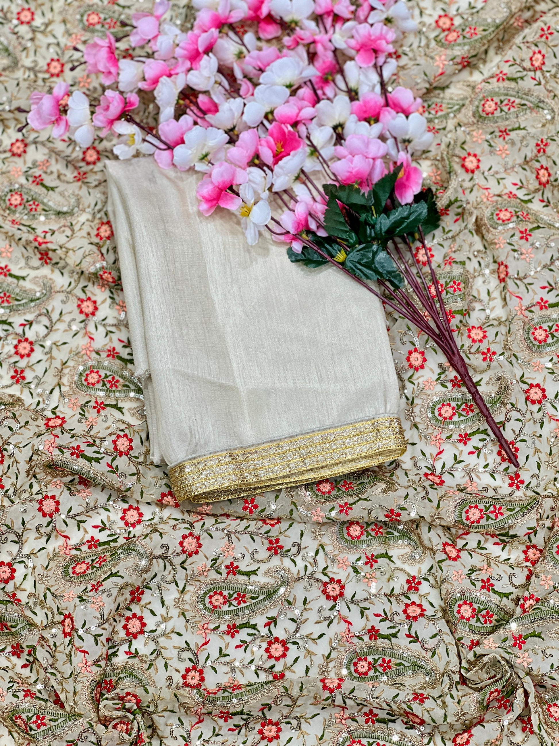 🏷️ Saree :- Heavy Fox Georgette With Multi + Zari Embroidery & 3.MM Sequence In Pallu_Skirt Work Saree And Readymade Embroidery Lace Work