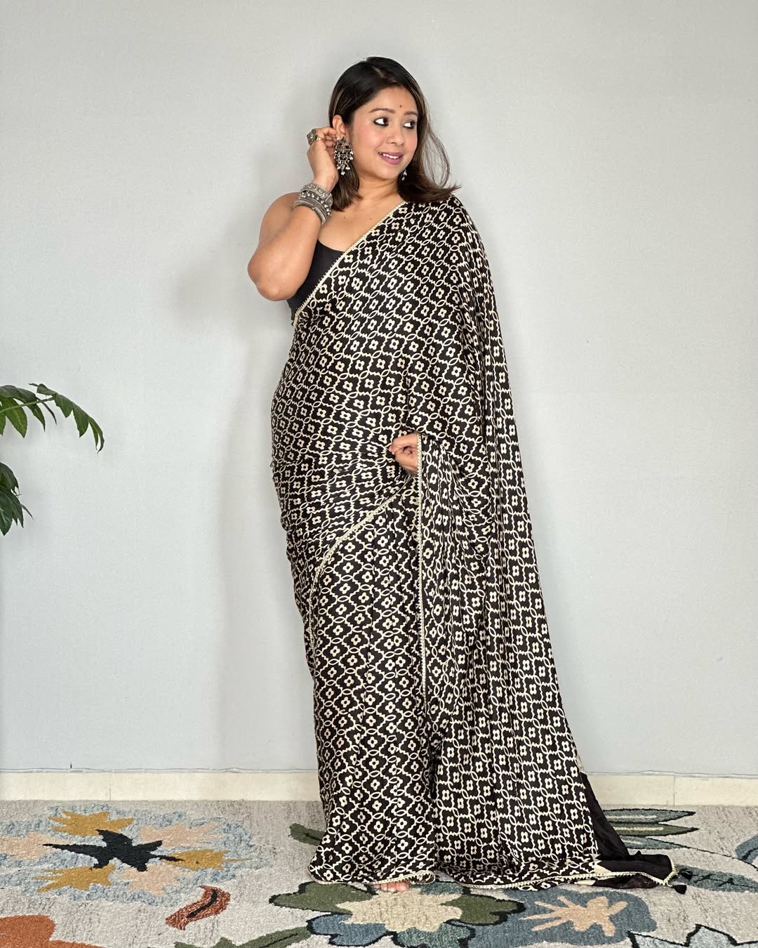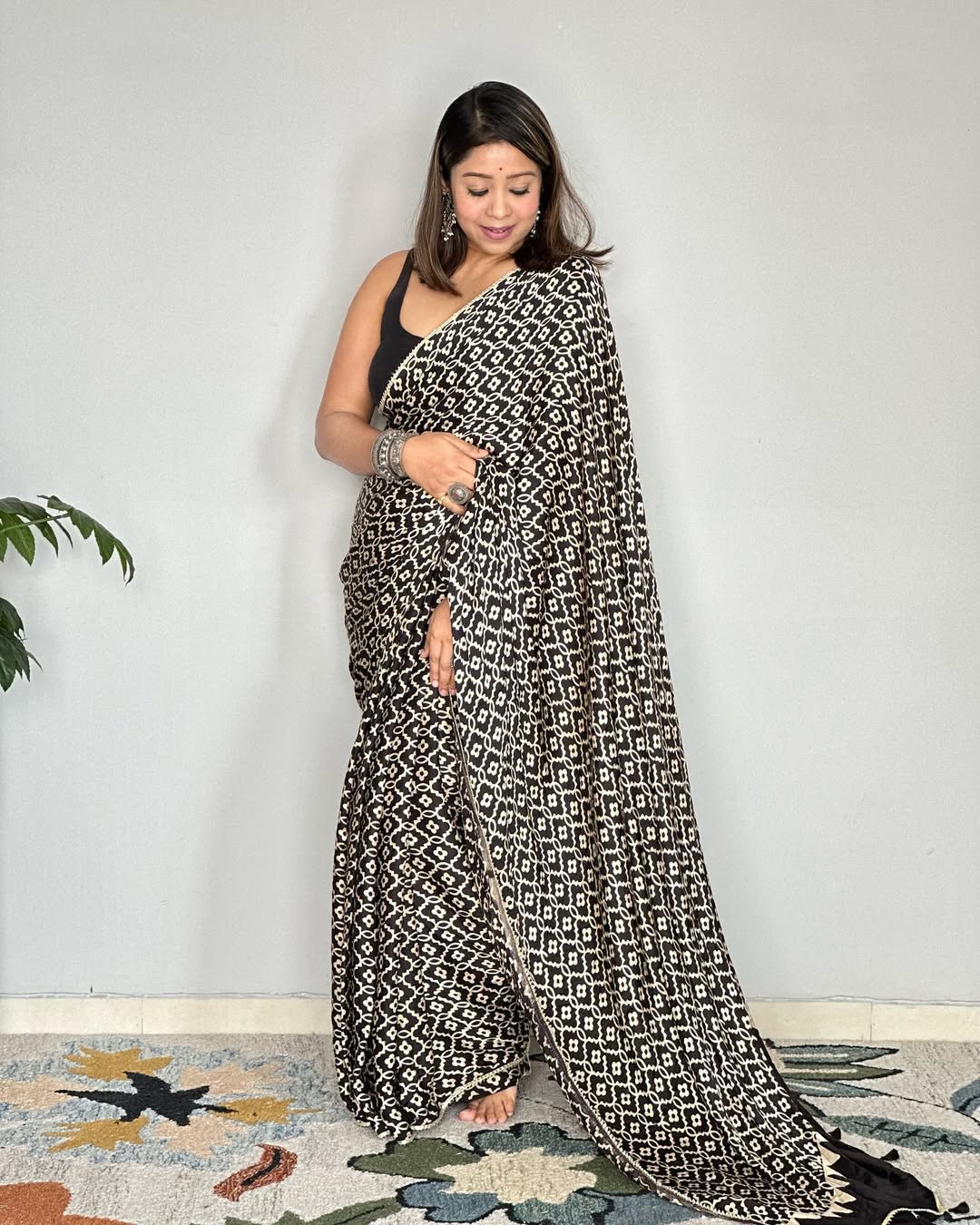 Black Ajrakh Primum Modal Silk Saree With Blouse
