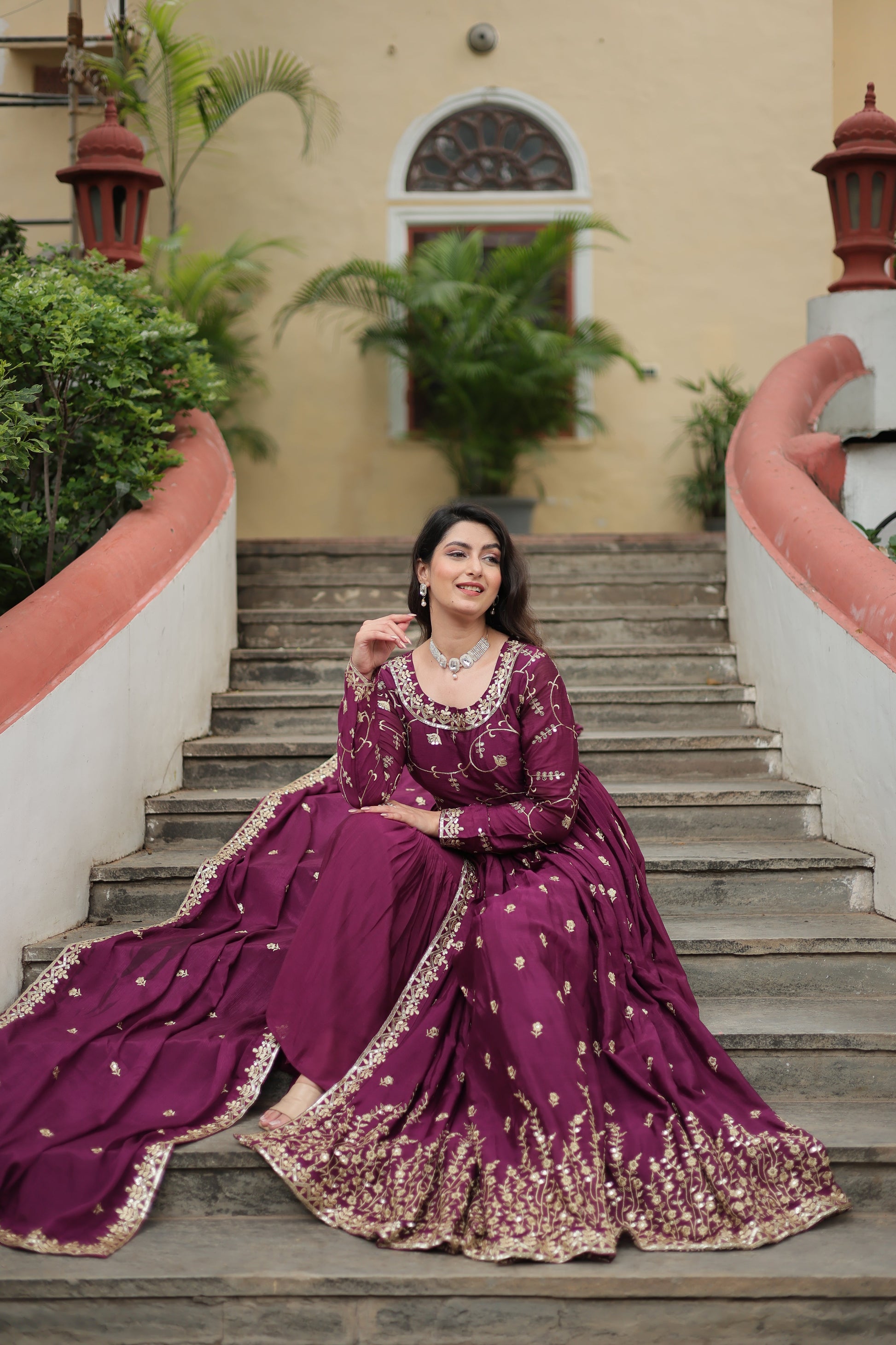 Wine Designer Readymade Top-Sharara-Dupatta Sequins Embroidered Chinon Suit