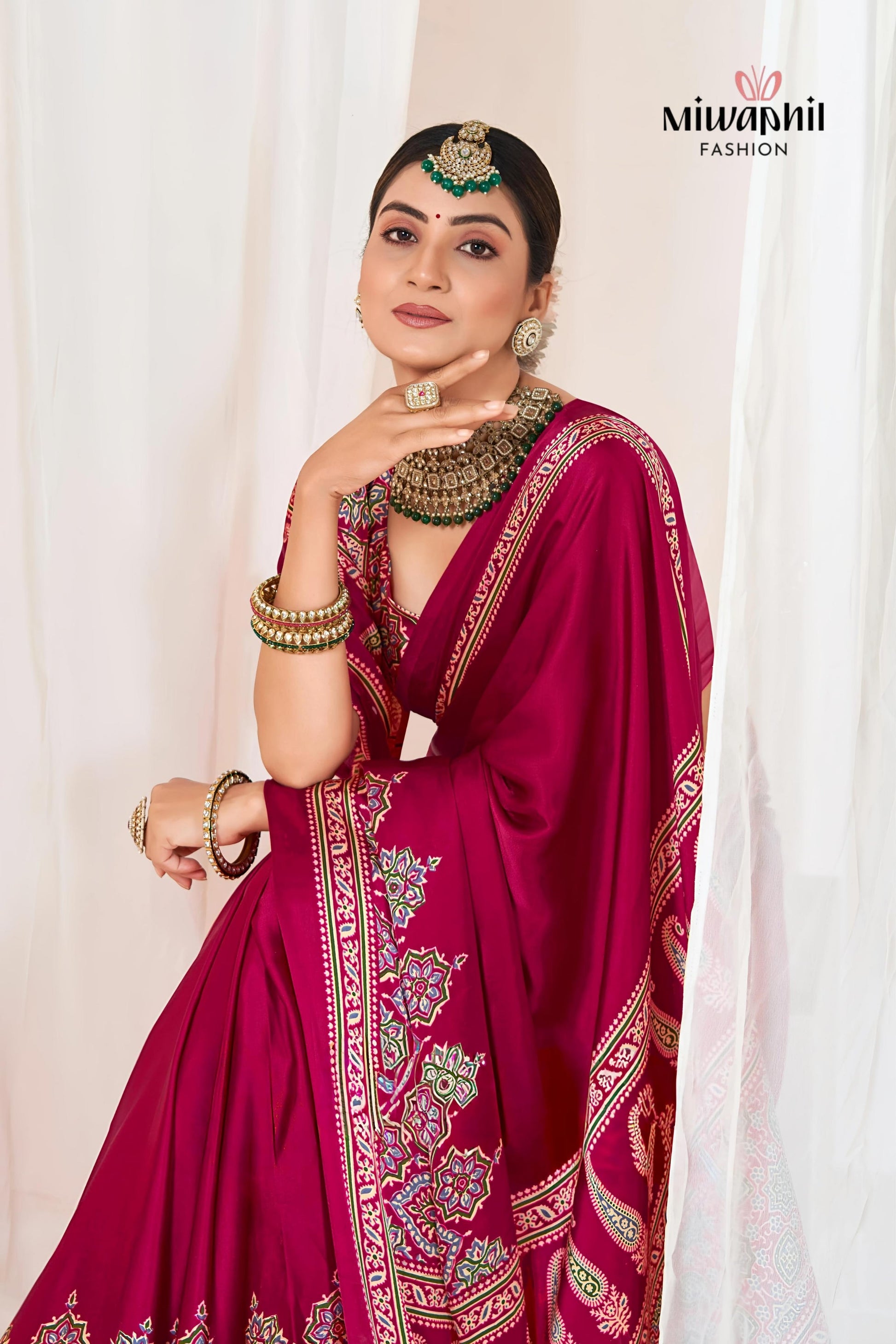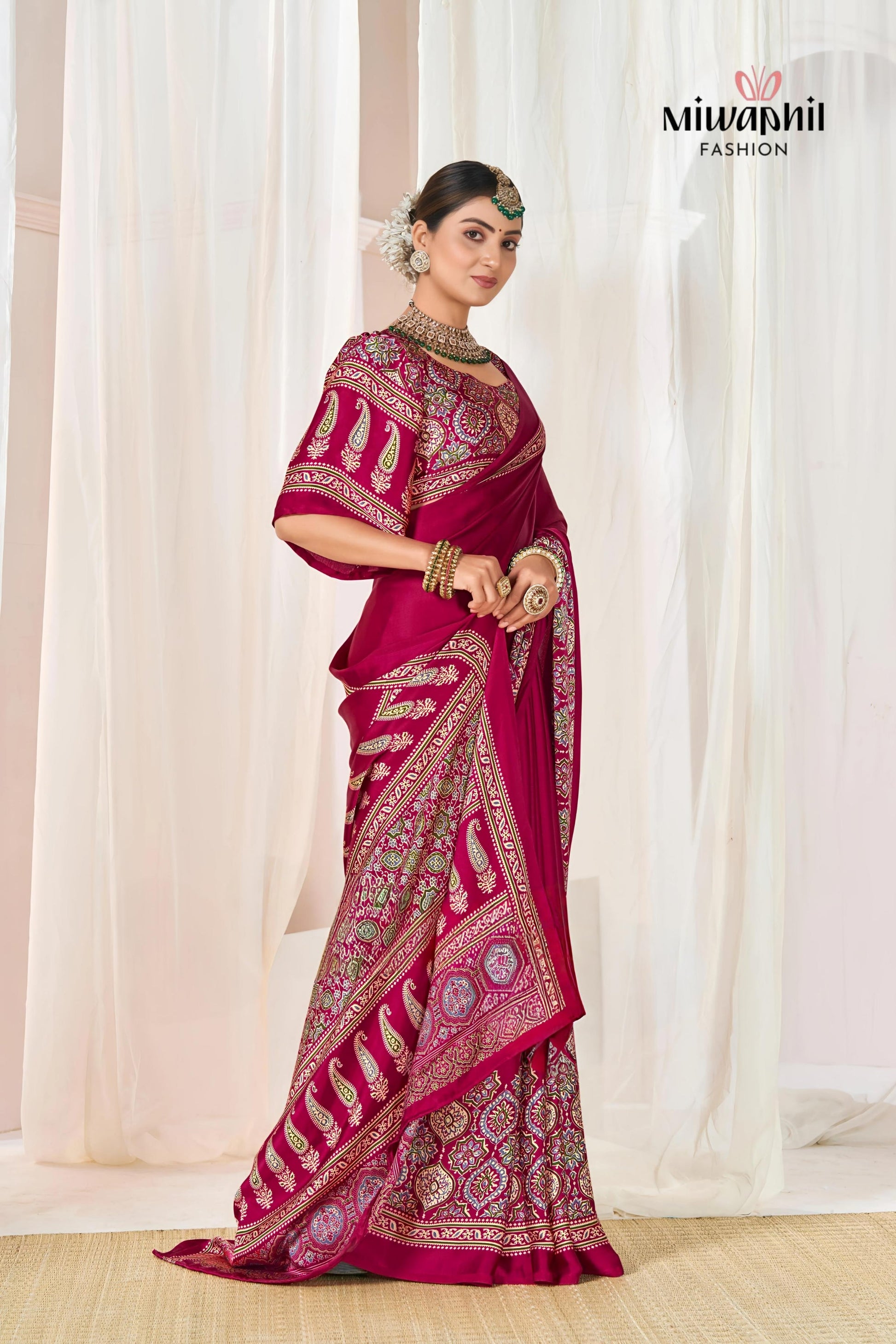 Rani Ajrakh Printed Modal Silk Plain Saree With Ajrakh Blouse P6