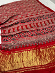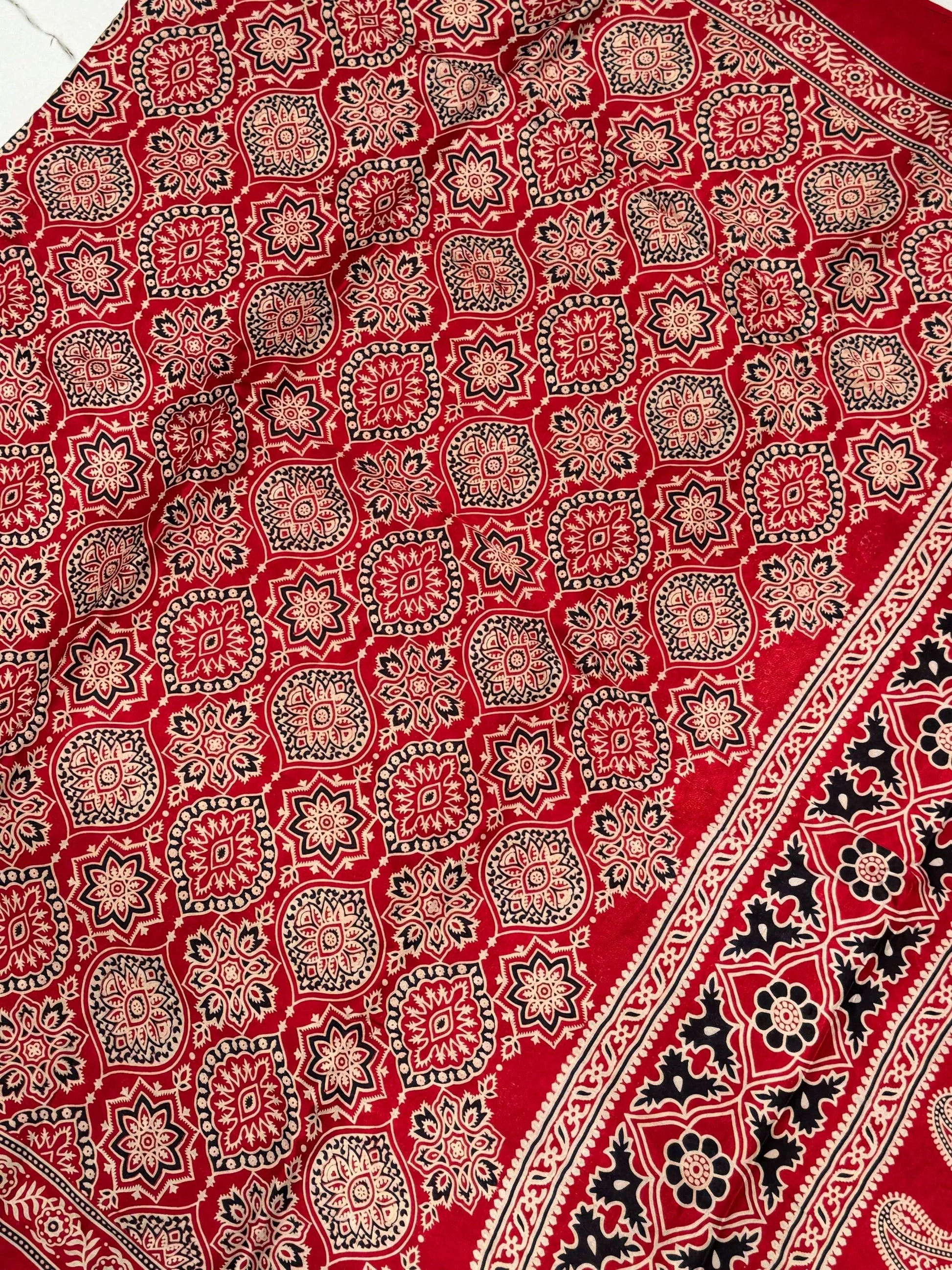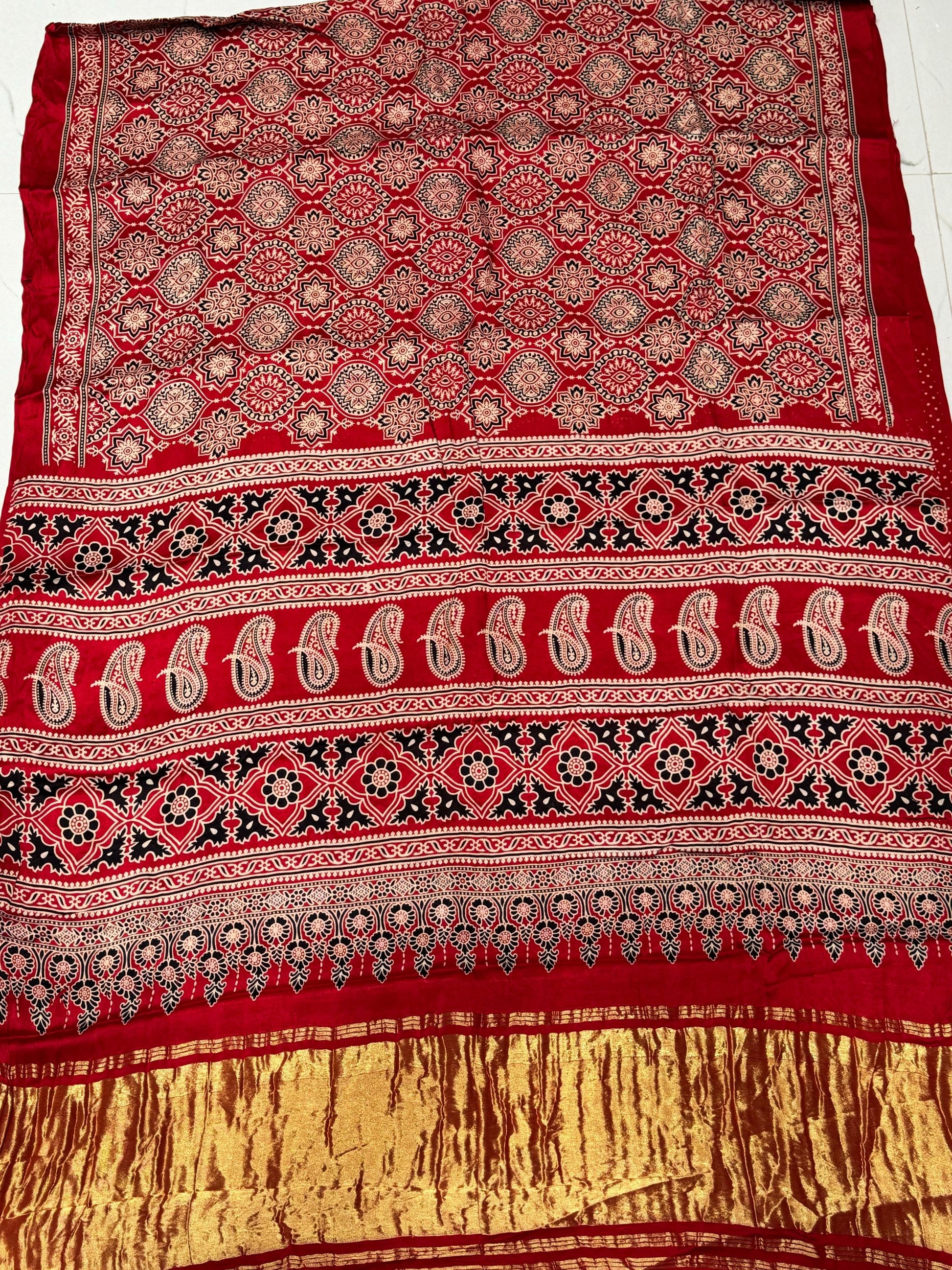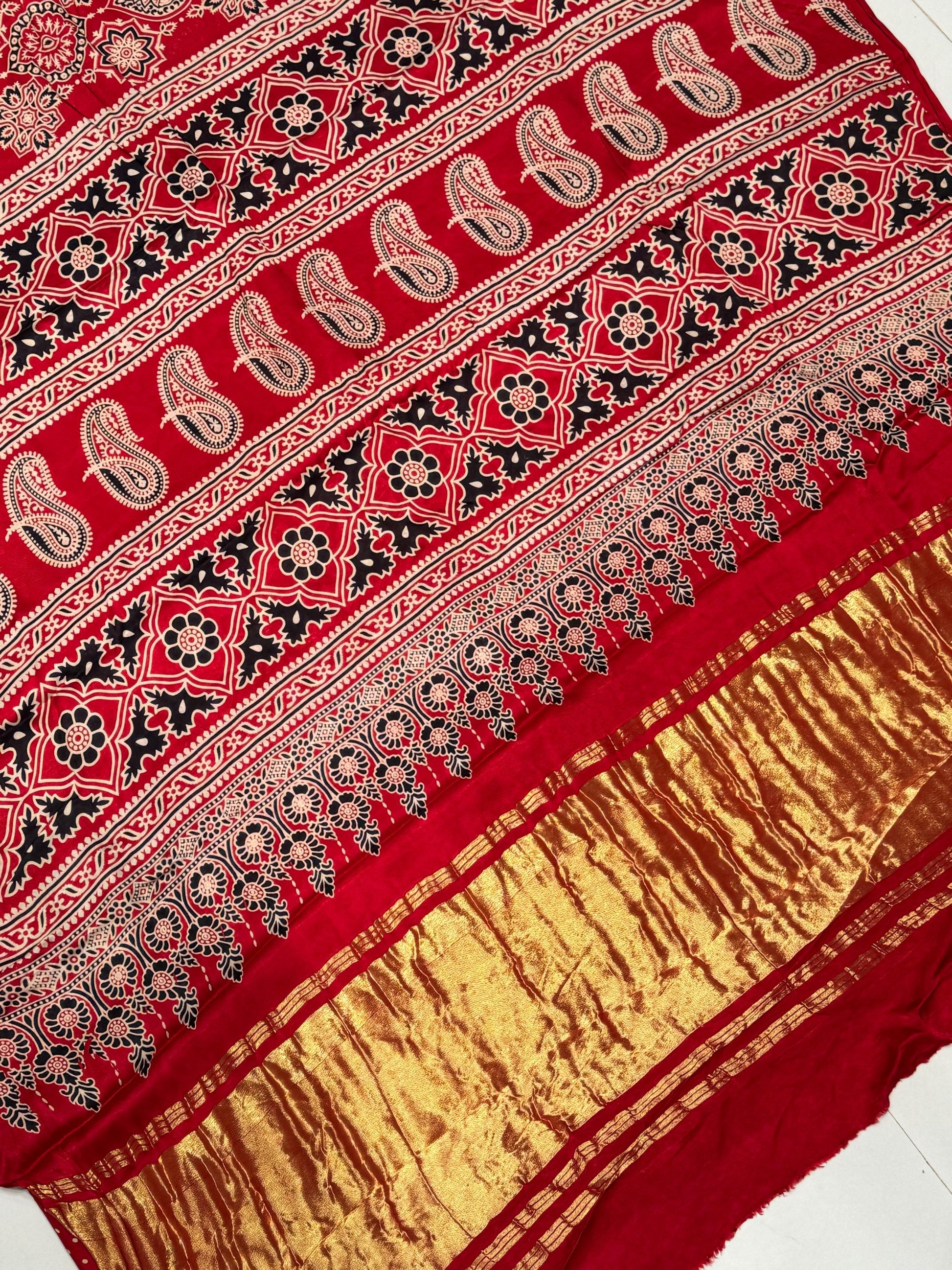 Red Ajrakh Hand Block Modal Silk Saree With Zari Pallu A2