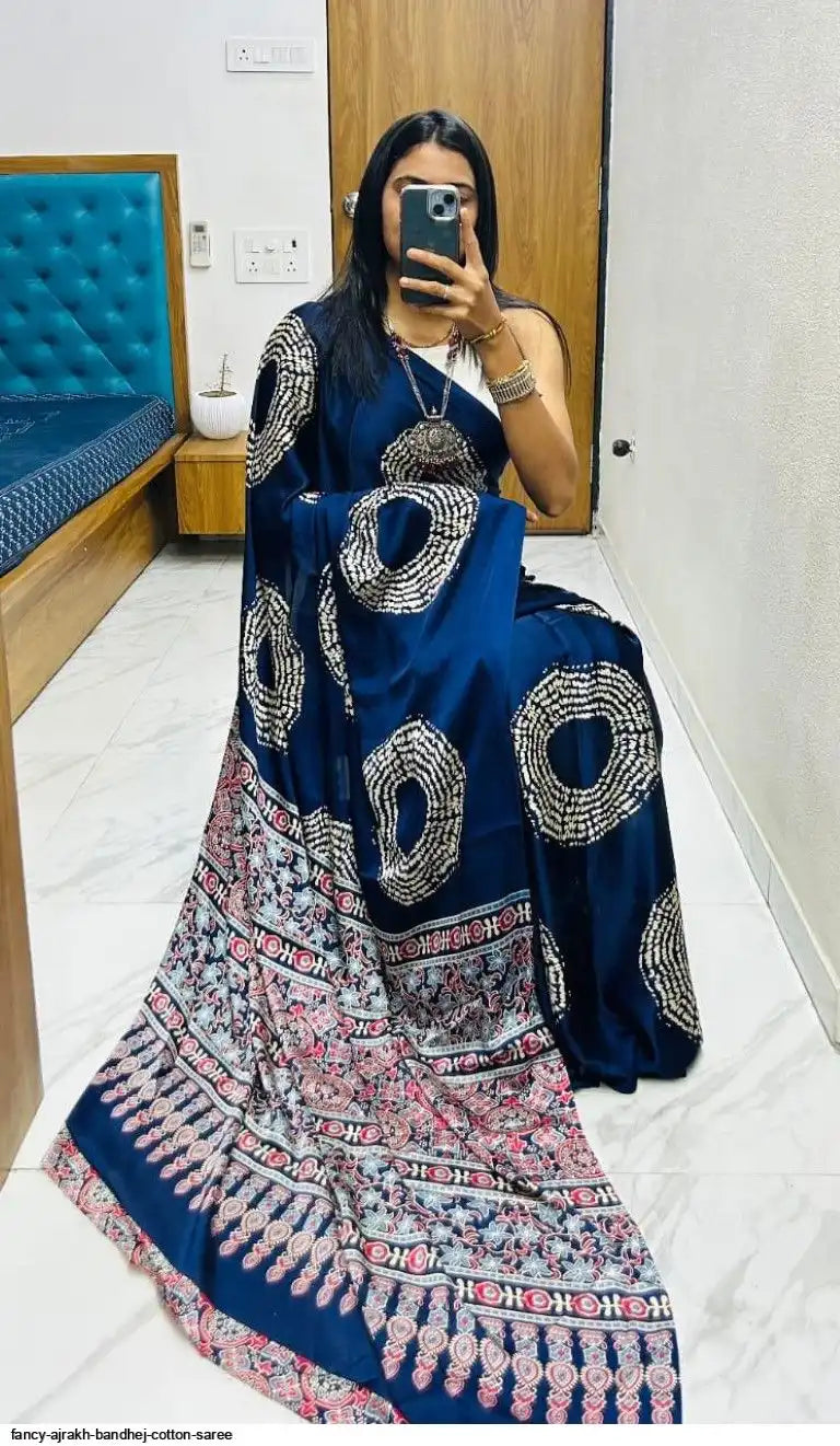 Available in semi gaji silk ajrakh natural digital print saree with ajrakh and fancy ajrakh pallu saree Same fabric Ajrakh blouse.