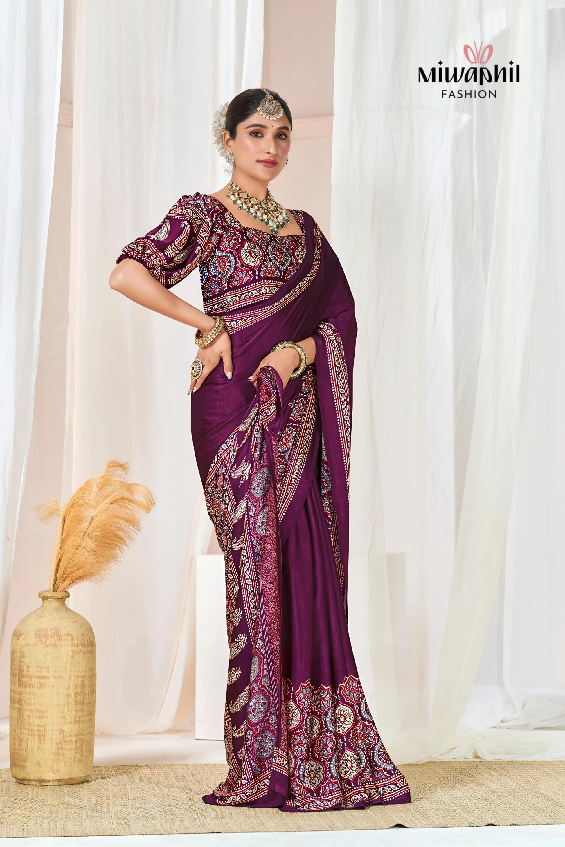Wine Ajrakh Printed Modal Silk Plain Saree With Ajrakh Blouse P6