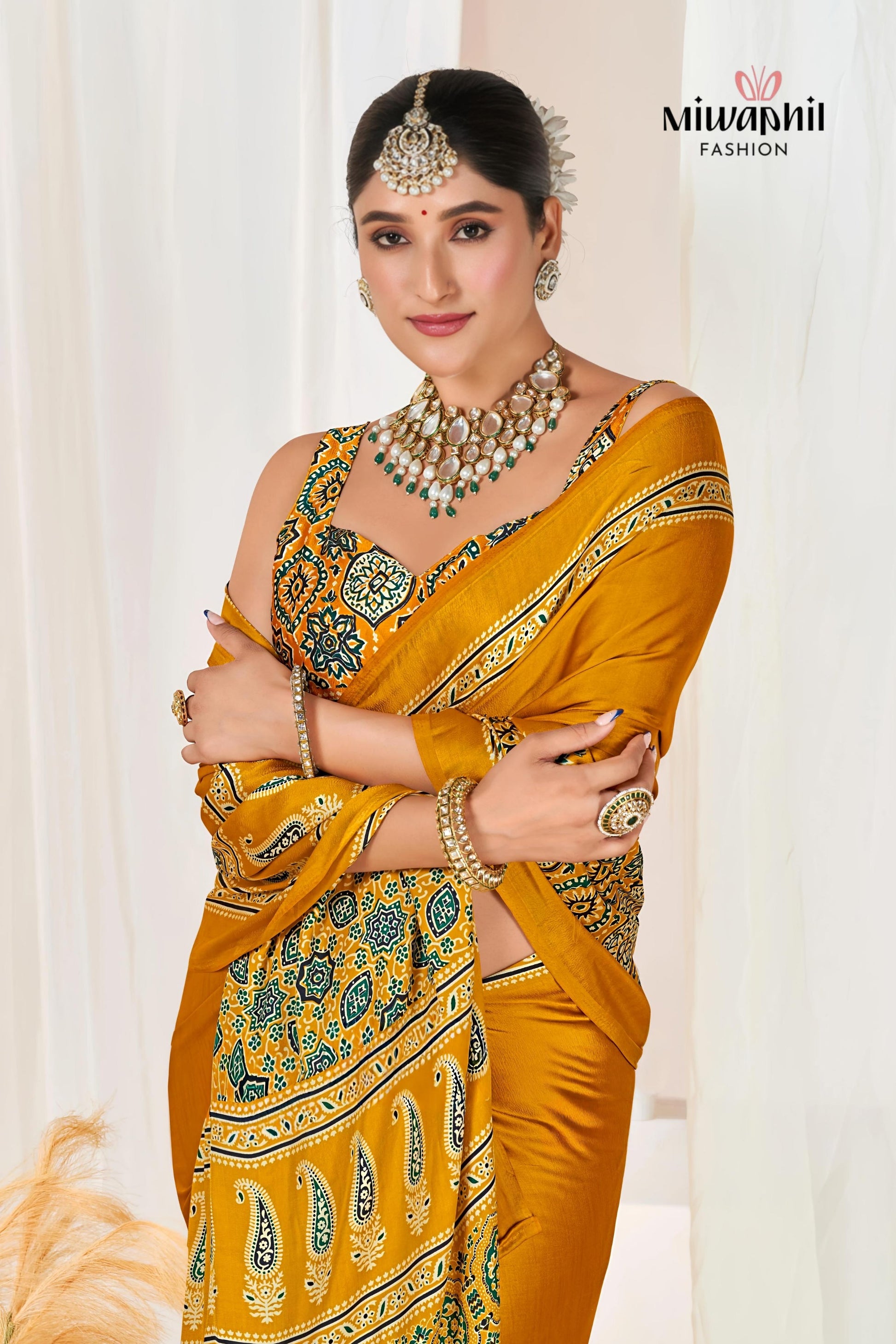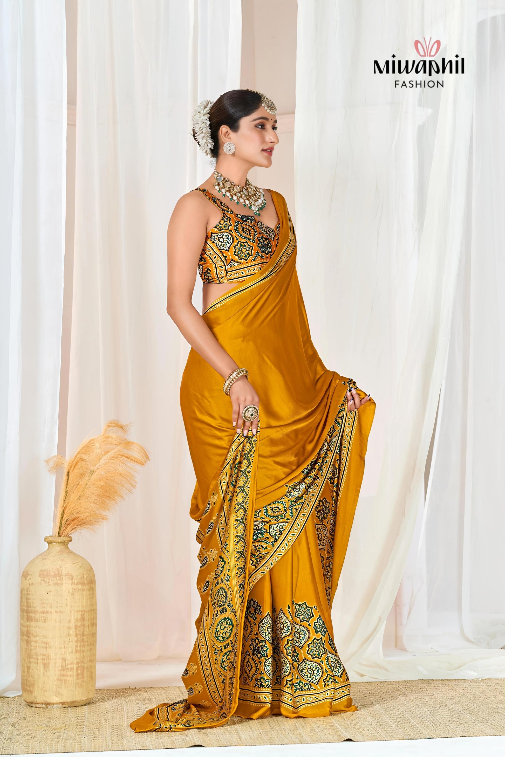 Yellow Ajrakh Printed Modal Silk Plain Saree With Ajrakh Blouse P6